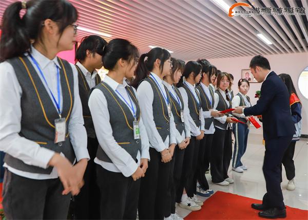 来自杭州新东方酒店管理2班的李可馨同学,作为学生代表上台发言,她首先向学校、合作企业所提供的良好学习和就业平台、发展机遇致以了衷心的感谢,并坚定地表达了自己认真学习的决心和信心!立志成为有智慧并富有激情的人;胸怀大志并脚踏实地的人;德才兼备并勇于创新的人;负有责任并敢挑重担的人。