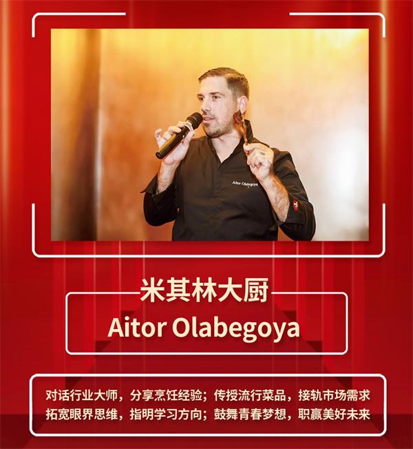 曾获“西班牙青年厨师大赛”冠军的Aitor Olabegoya,他曾跟随西班牙传奇名厨Ferran Adria研习厨艺,并任职于许多世界知名餐厅,包含西班牙传奇名厨Ferran Adria的米其林三星餐厅「EI Bulli」 、全球首位荣获累计7颗米其林星的女主厨Carme Ruscalleda餐厅「Sant Pau」等。他更曾以北京Migas餐厅行政主厨身分,连续四年获颁Time Out杂志「北京年度主厨」大奖。Aitor Olabegoya主厨目前担任Josper、Foodini、Beef On Food Wagyu等国际餐饮品牌之形象大使。