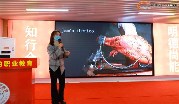 签约仪式上,西班牙协会曾盈华老师为同学们详细地讲解了西班牙火腿的来源和切腿师的职业发展前景:西班牙广受食客欢迎且地道的美食非伊比利亚火腿莫属,高端的食材和严谨的处理方式催生出火腿师、火腿切割师、侍肉师等新兴职业。专业切腿师工作环境高雅,待遇优厚,目前此类国内人才非常短缺,故职业发展前景十分广阔。在为期三天两夜的培训中学子们可以深入了解西班牙火腿的发展历程,明确制作过程与等级划分,掌握不同部位的火腿切割方法。