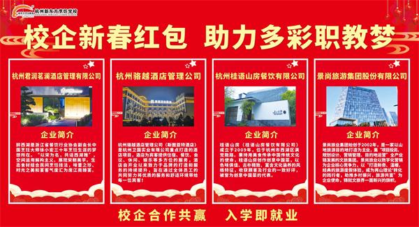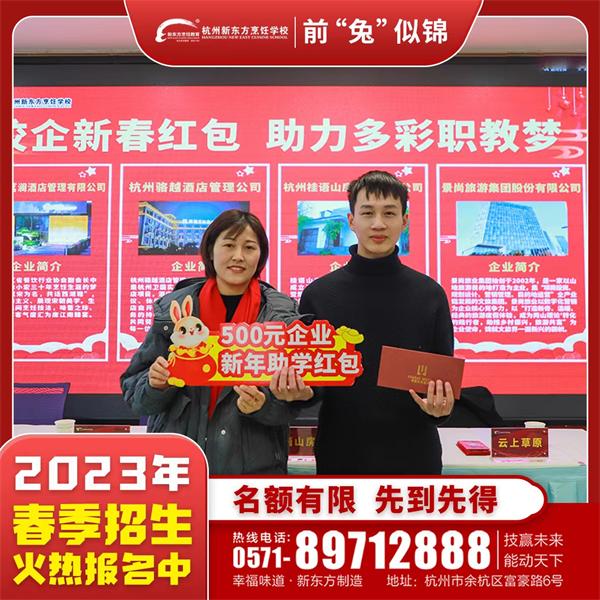 正值开学季,为助力大家实现技能成才梦。近日,杭州新东方职业学校携手杭州君润茗澜酒店管理有限公司、杭州骆越酒店管理公司、杭州桂语山房餐饮有限公司、景尚旅游集团股份有限公司四家企业,现场派发校企新春红包,欢迎新生学子报名入学。
