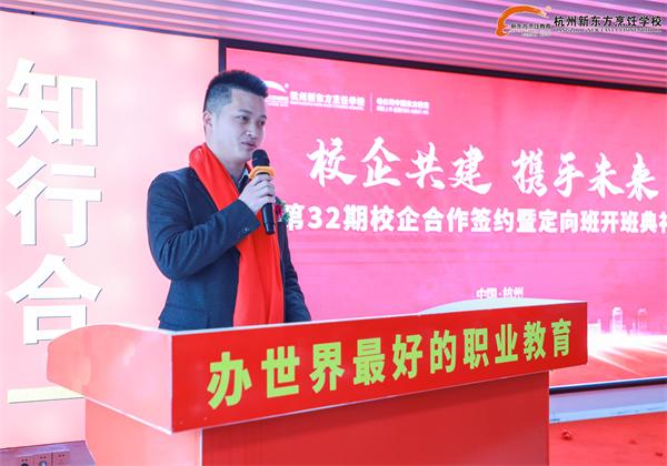首先,杭州新东方职业学校校长助理付顺洪为本次活致欢迎词,他表示校企定向班是学校和企业建立的一种深层合作模式,做到了应社会所需,与市场接轨,为教育行业发展带来了新气象。此次定向班的成功签约预示着校企双方的合作迈向了一个崭新的高度,希望双方继续携手共赢,在这座友谊的桥梁上并肩前行,为中国餐饮业的发展、为培养更多的厨师精英而努力奋斗!