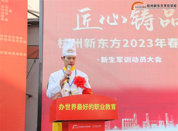 典礼在庄严的国歌声中拉开了序幕,新生代表谢雨宏对学习生活作了精彩的发言,谢同学表示将一步一个脚印朝着雄伟的目标迈进,好好珍惜学习时光。希望同学们能以饱满的热情、昂扬的斗志去直面军训,以优异的军训成果和良好的精神风貌展现新生的风采。