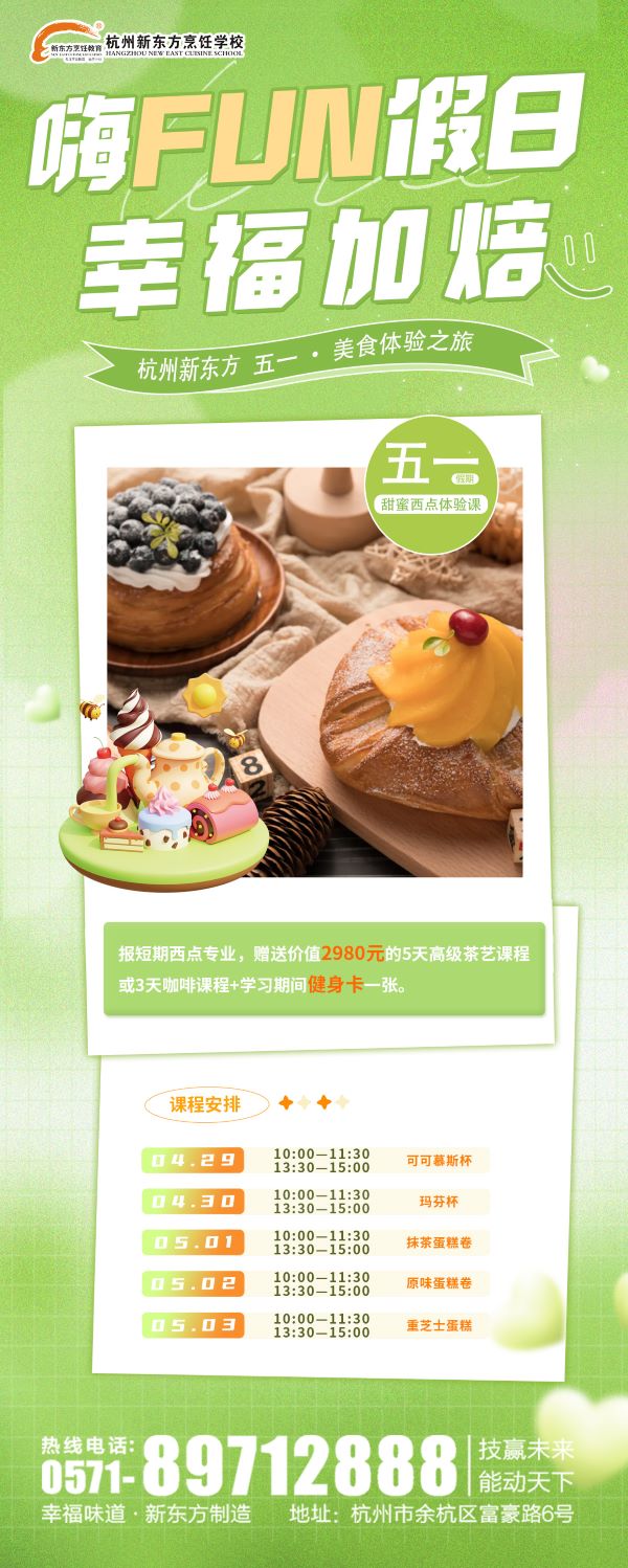 为让广大有志于学习西点的同学实地考察学校,充分了解自己的兴趣爱好,适应学校课程,以五一假期为契机,学校特开展系列西点体验课,包括慕斯杯、玛芬杯、蛋糕卷等等,欢迎广大学子来校参观学习!