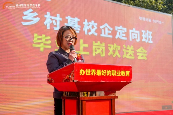 杭州新东方校长汪巧林发表总结讲话,他向圆满完成学业、顺利入职乡村基的28名学子表示热烈祝贺,向长期以来支持学校发展的乡村基各位领导嘉宾致以诚挚感谢。
